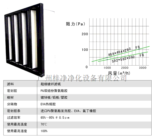 濾料超細聚丙烯纖維,呈V型排列在一個非常緊密的聚苯烯或鋁合金的支撐外框內;