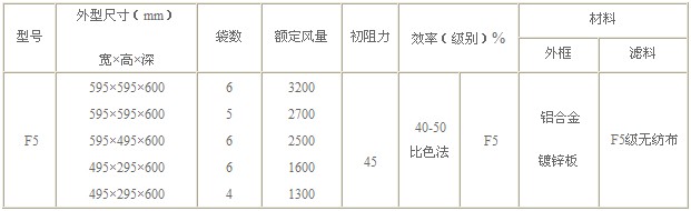 F5級袋式中效過濾器型號尺寸及其它參數: