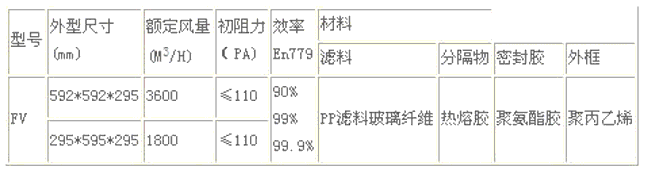 FV型亞高效過濾器(塑框)型號尺寸及其它技術參數(shù):